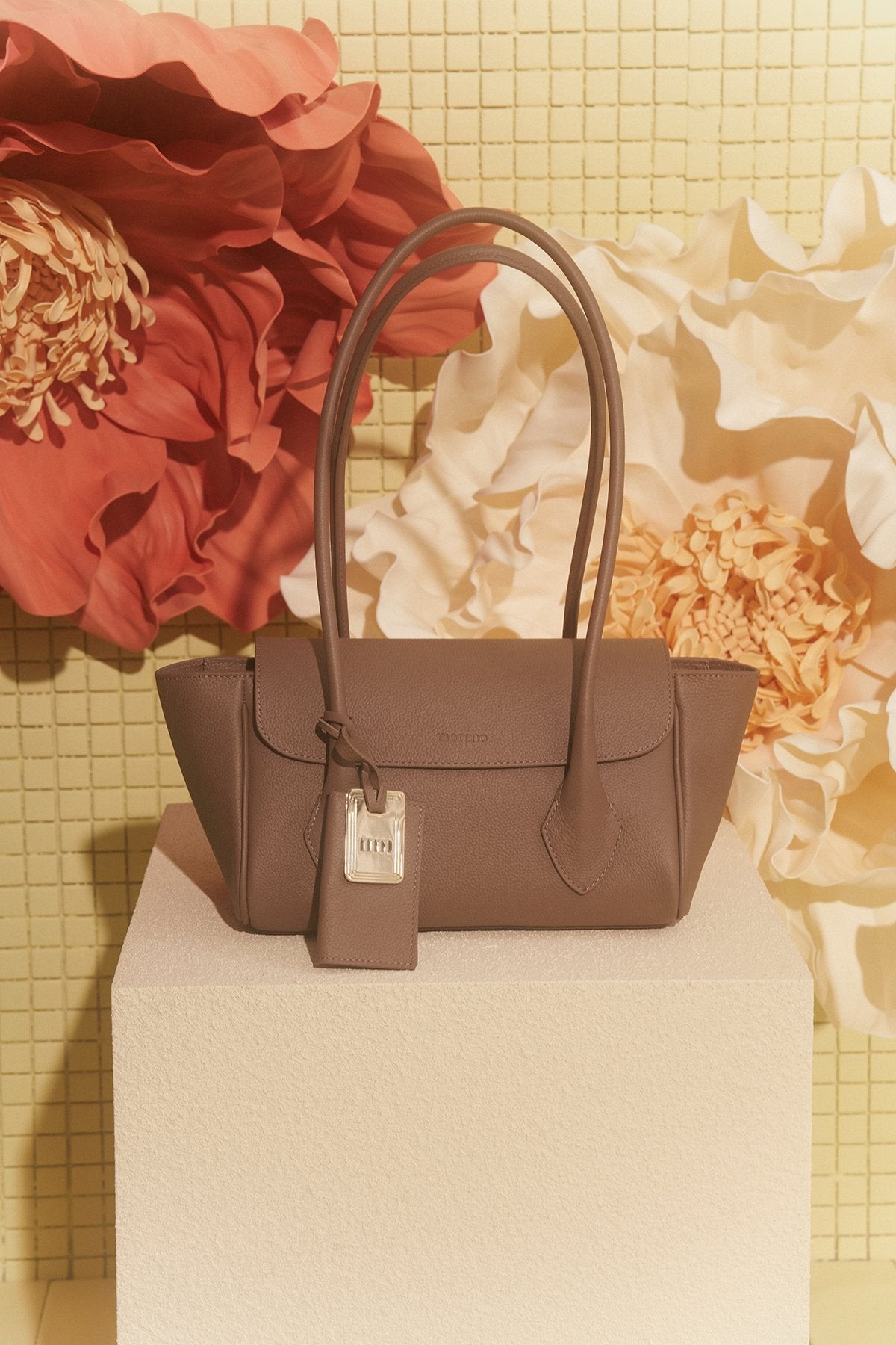 Moreno Leather Bag Completely handcrafted. Inside and outside made of cowhide leather. Features a metal logo detail on the front. Height: 16 cm Width: 26 cm Depth: 11 cm